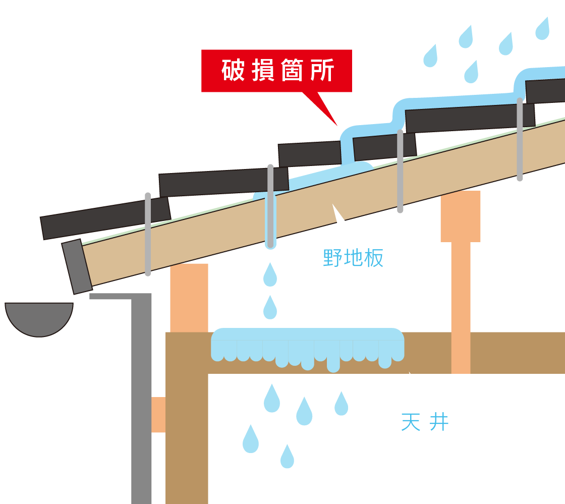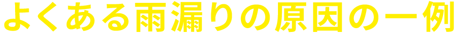 劣化や突風などの衝撃で瓦が割れてしまい、屋根の雨水を雨どいへ流せず、野地板へ浸水している状態です。瓦の破損した部分から雨水が浸水し、瓦と防水シートに打ち付けられた釘を伝い、天井板へ流れ込んでしまう状態です。釘が野地板を突き抜いていない場合は野地板の浸水で収まりますが、深く差し込まれた釘が野地板を突き抜いてしまっていると、このような雨漏りが起こる場合があります。
