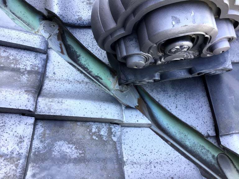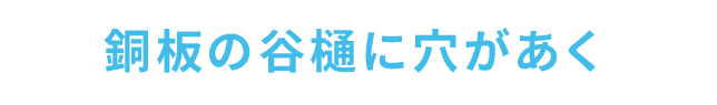 瓦屋根の入角部分に銅板の谷樋が入っている場合 早ければ数年で穴があきます。昔は銅板は非常に丈夫で腐食しないといわれて使用されてきましたが、瓦の釉薬(ゆうやく)や酸性雨・雨水の落下による衝撃を長期間受ける為、穴があくといわれています。同じ理由で銅板の樋にも穴があいてしまいます。