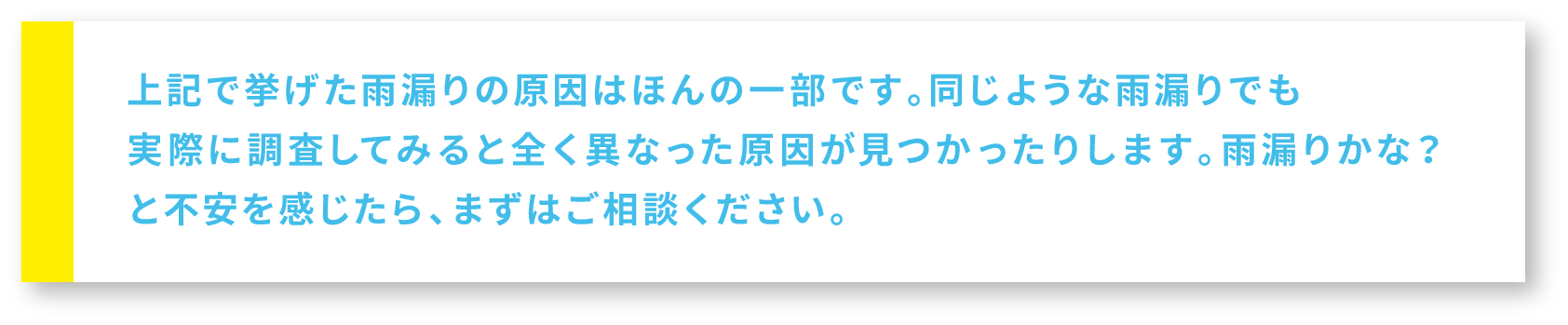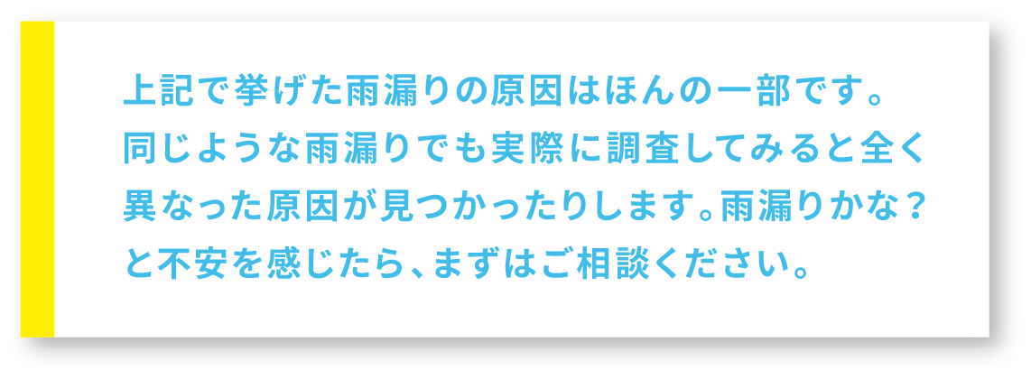 雨漏りを見つけたら早く何とかしなくちゃ… と焦ってしまいがちですが、原因は様々です。 田中板金では原因をしっかり調査し、直る修理を行います。