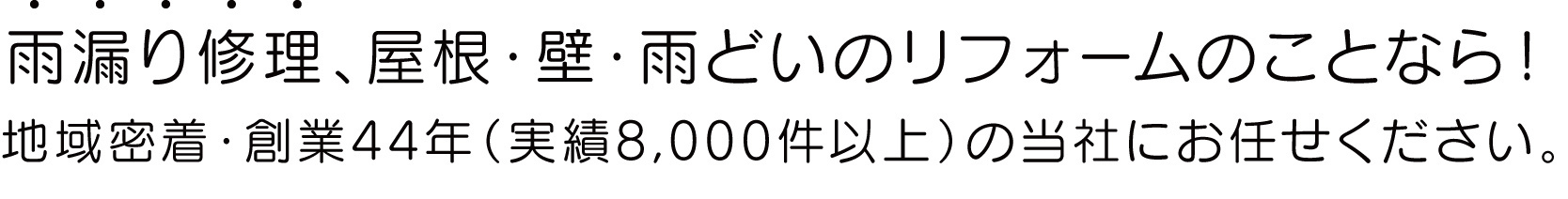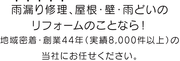 田中板金は創業から44年間、地域の皆様に支えられ屋根・外壁工事・雨漏り修理のエキスパートとして、8,000件以上の施工実績を重ねてまいりました。 特に、雨漏り修理の施工は建築業界の中でも非常に難しく、豊富な知識と熟練した業者でなくては絶対に止めることはできません。 「何件も業者が来たけれど直らなかった」、「ずっと雨漏りで悩んできた」すべて田中板金が解決いたします。住宅・工場・店舗など、あらゆる建築物件の屋根・外壁にご対応いたします。すべてのお客様に、安心と快適な生活を提供できるよう全力で取り組んでまいります。緊急のご依頼でもスピーディーに対応しますので、まずはお気軽にご連絡ください。